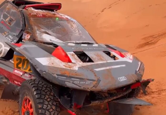 El Audi RS Q e-tron del piloto madrileño clavó su morro en la arena, tras una duna cortada, y dio una vuelta de campaña hacia delante, cayendo todo el peso del vehículo sobre su techo.