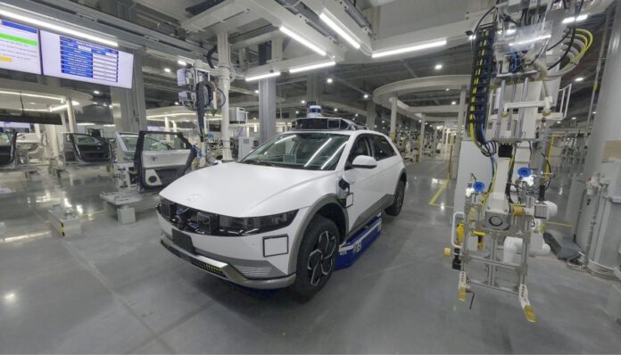 Los AGV (vehículos guiados automatizados, por sus siglas en inglés) son robots industriales que se mueven de forma autónoma, sin un operador. En HMGICS se encargan del transporte de carrocerías entre diferentes células de producción, asumiendo el papel de las cintas transportadoras de una fábrica tradicional.